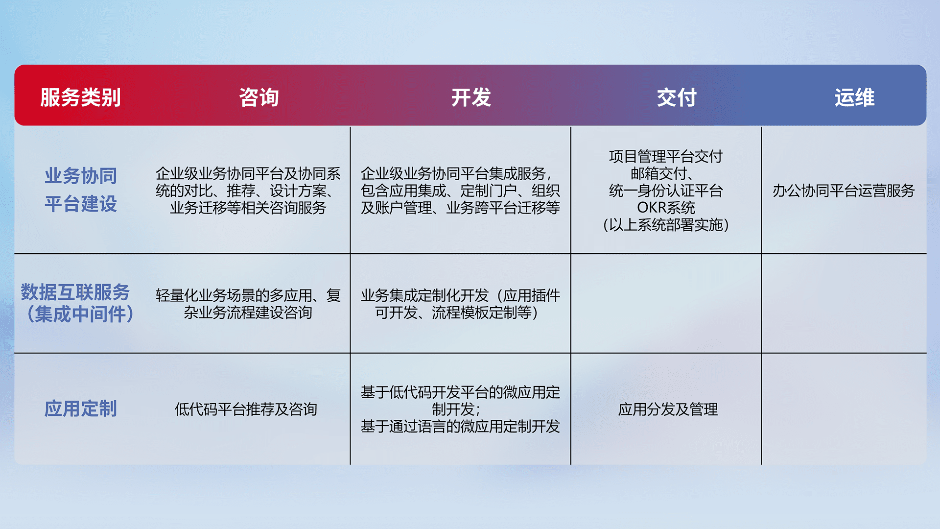 针对钉钉、、、企微、、IDaas等平台级产品提供产品的规划、、方案、、、交付、、定制化开发等服务,,,,实现如统一协同办公、、、、智能客户服务、、、、混合会议管理、、、、智能数据查询、、等业务场景,,,实现数字化转型。。。。